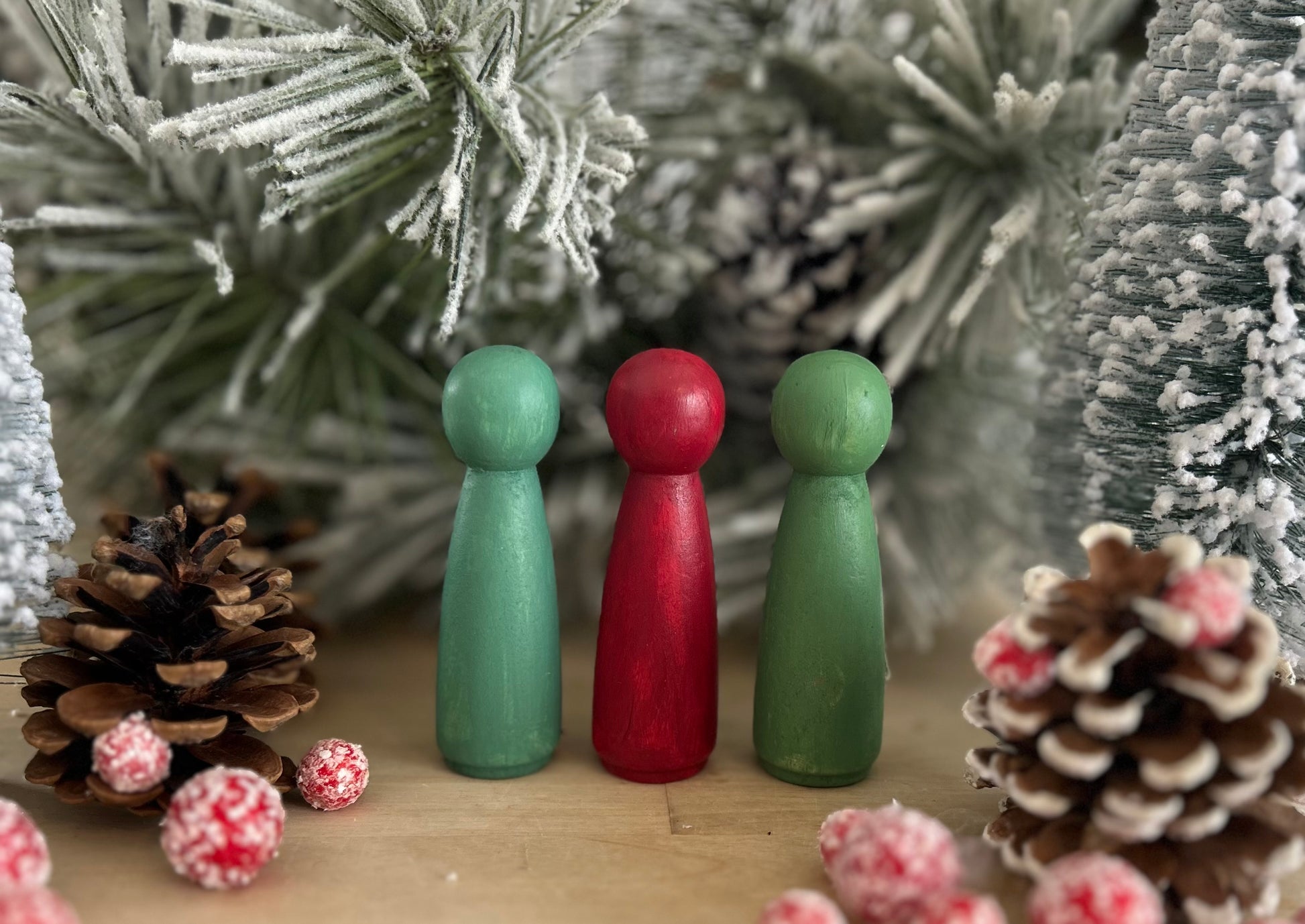 These hand-painted winter peg dolls feature soft, rosy faces and richly detailed botanical designs, bringing a touch of classic holiday charm to your home. Perfect for seasonal displays, nature tables, or gentle imaginative play, each piece adds a warm, handcrafted beauty to the winter season.