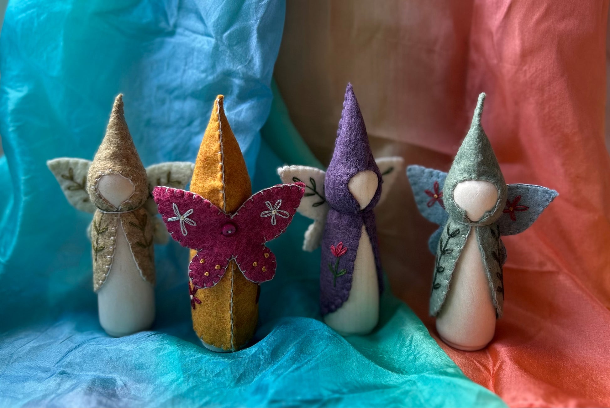 These whimsical peg doll fairies are hand-sewn from soft felt, with delicately embroidered leaves and flowers to add a touch of woodland magic. Their detachable, interchangeable wings invite endless imaginative play, allowing children to create new stories and characters each time.